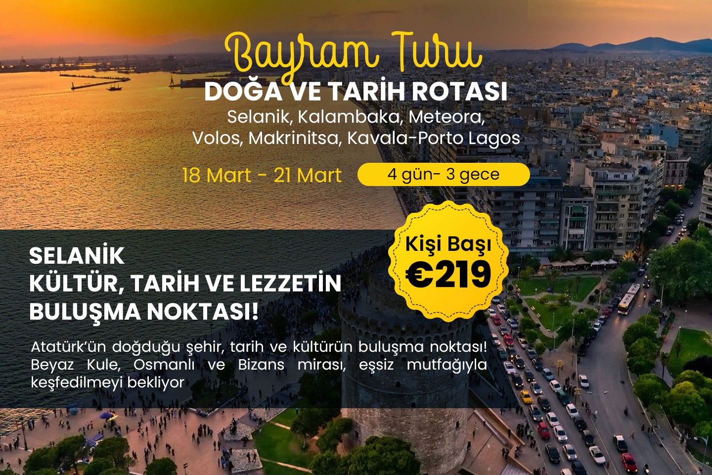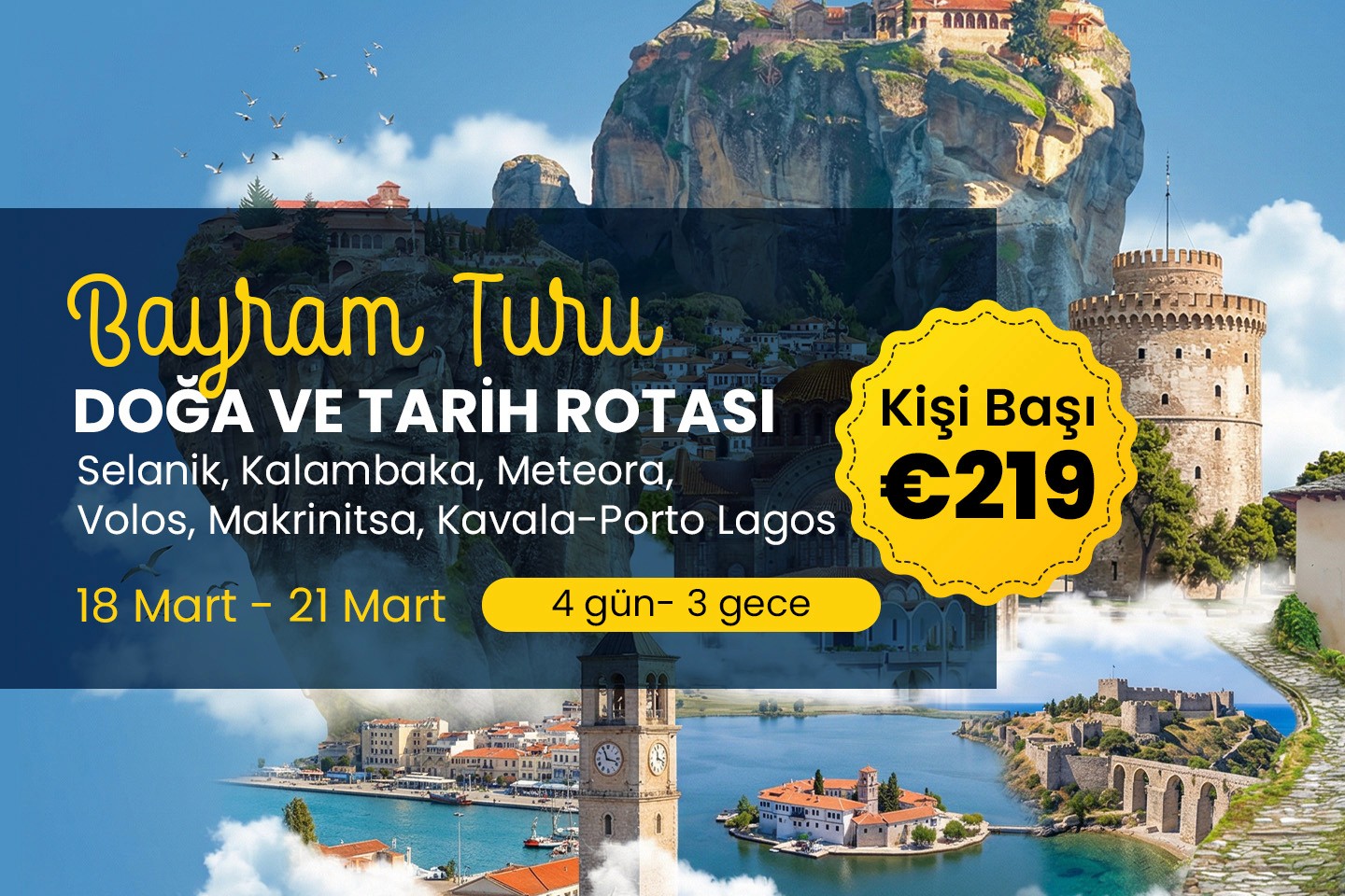 Türkiye’den Yunanistan’a düzenlenen Bayram turları, kısa sürede çok fazla yer görmeyi sevenler için hem kültür–tarih hem de nefes aldıran Ege manzaralarıyla dopdolu bir kaçamak sunuyor. Corfu Tur olarak 35+ yıllık turizm tecrübemizle, bayram dönemine özel hazırladığımız bu rotada misafirlerimize güvenli, konforlu ve akıcı bir seyahat deneyimi yaşatıyoruz. Bu programda; Osmanlı ve Bizans izlerini taşıyan Selanik, etkileyici sahil dokusuyla Kavala, UNESCO Dünya Mirası listesindeki Meteora Manastırları, Pelion’un “balkonu” olarak anılan Makrinitsa, Ege’nin canlı liman kenti Volos ve doğasıyla öne çıkan Porto Lagos – Vistonida Gölü tek turda bir araya geliyor. Üstelik program “extra tur ücreti yok” mantığıyla planlandı: İlan edilen fiyatın içinde rota boyunca yapılacak şehir ve kültür gezileri yer alıyor. Bayram turumuz 4 gün 3 gece olarak düzenlenir ve 2 gece Selanik şehir merkezinde Vergina Hotel konaklamasıyla gerçekleşir. İstanbul’dan belirlenen kalkış noktalarından, modern ve bakımlı otobüslerimizle gece saatlerinde yola çıkar; sınır geçişi sonrası Yunanistan’ın kuzeyini adım adım keşfetmeye başlarsınız. Selanik’te Beyaz Kule, Aristoteles Meydanı ve Atatürk’ün Doğduğu Ev gibi simge noktaları görür; Meteora’da gökyüzüne uzanan manastırları panoramik olarak izler; Makrinitsa’nın taş sokaklarında dolaşır; Volos’ta sahil atmosferini yaşarsınız. Dönüş gününde Kavala ve Porto Lagos çevresindeki tarihi duraklar ve Vistonida Gölü ziyaretleriyle rota tamamlanır. Bu tura katılım için Schengen vizesi veya yeşil pasaport gereklidir. Yol boyunca ihtiyaç molaları, profesyonel Türkçe rehberlik ve düzenli akış sayesinde “bayram kalabalığında bile” planlı ve rahat bir seyahat hedeflenir. Program ayrıca Jumbo ve Lidl market transferlerini de içerdiği için, dileyen misafirlerimiz alışveriş molalarında uygun fiyatlı ürünleri değerlendirebilir.