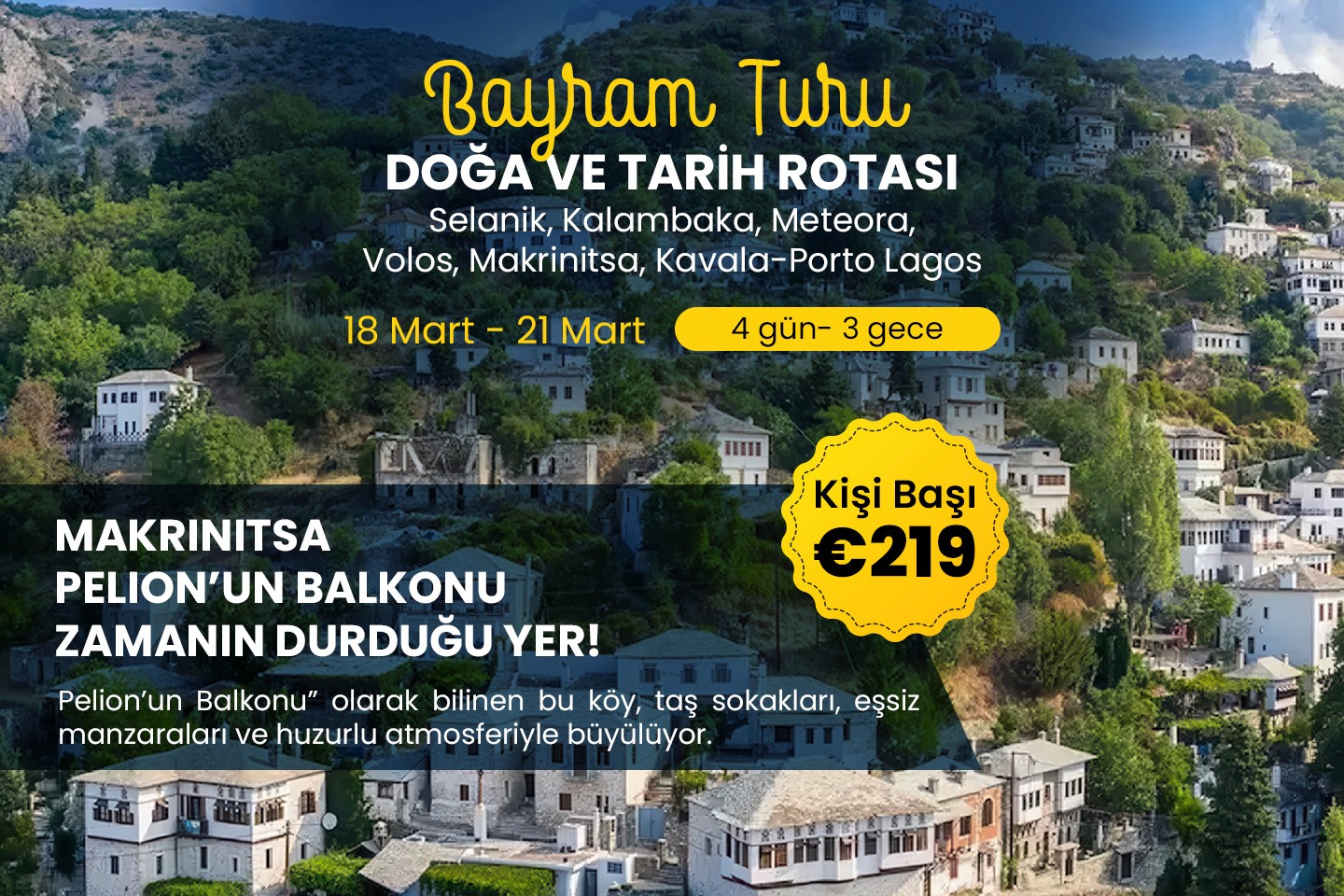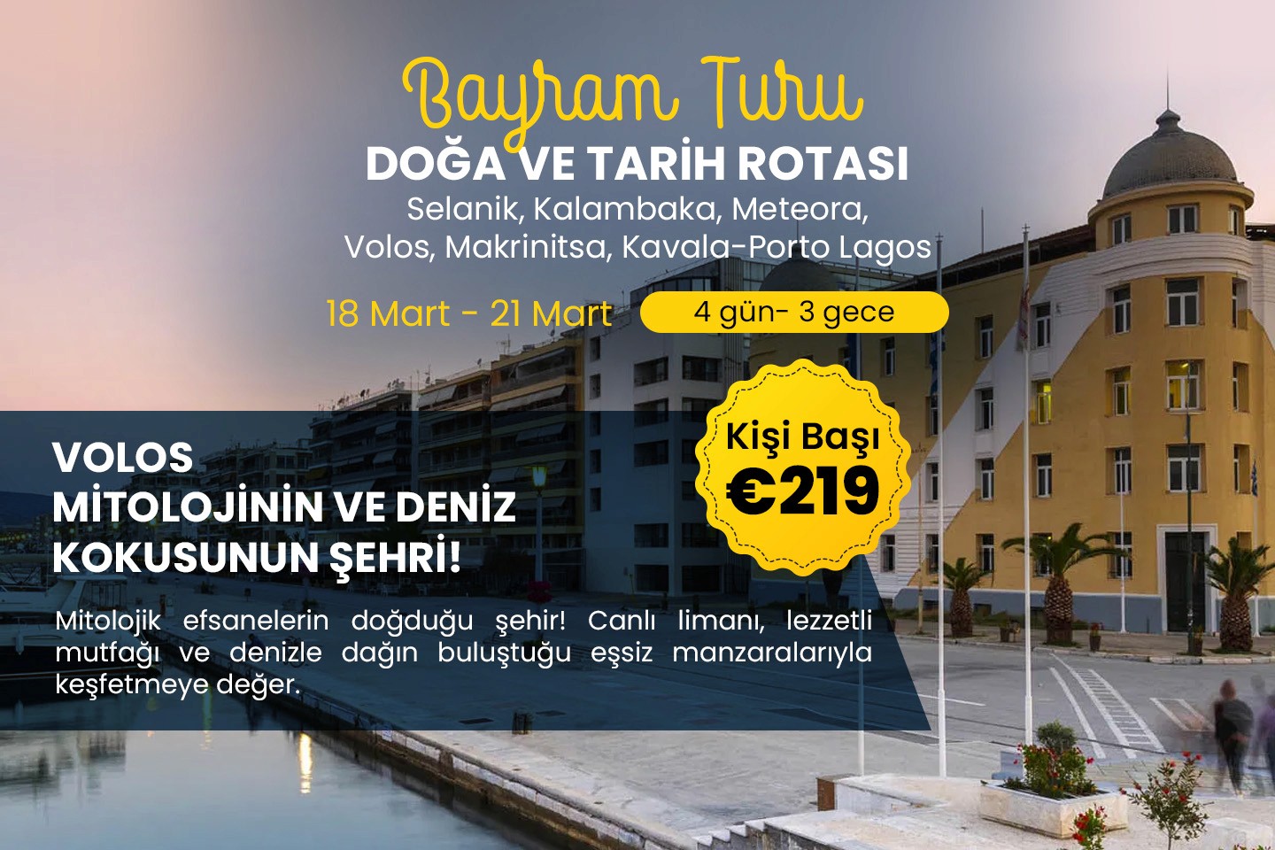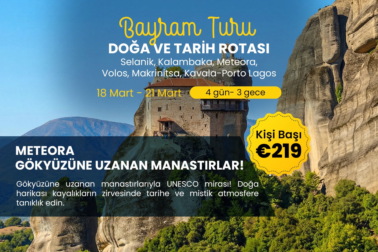 Yunanistan’ın kuzeyinde, tarihi şehirler, UNESCO Dünya Mirası listesinde yer alan yapılar ve Ege kıyılarının eşsiz manzaraları eşliğinde hazırlanan bu tur programı; kültür, tarih ve doğayı bir araya getiren kapsamlı bir rota sunmaktadır. Osmanlı ve Bizans izlerini taşıyan Selanik’ten, gökyüzüne uzanan manastırlarıyla Meteora’ya; Pelion Dağları’nın eteklerindeki Makrinitsa Köyü’nden, Ege’nin önemli liman kentlerinden Volos ve tarihi Kavala’ya ve Porto Lagos uzanan bu yolculuk, bölgenin en seçkin duraklarını tek programda keşfetme imkânı sağlar.